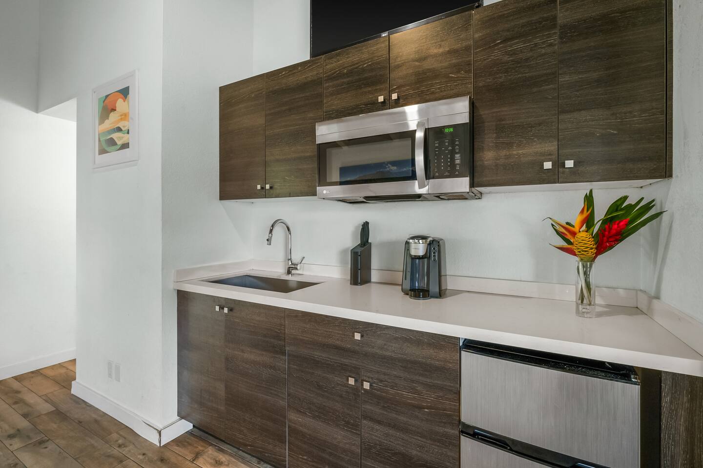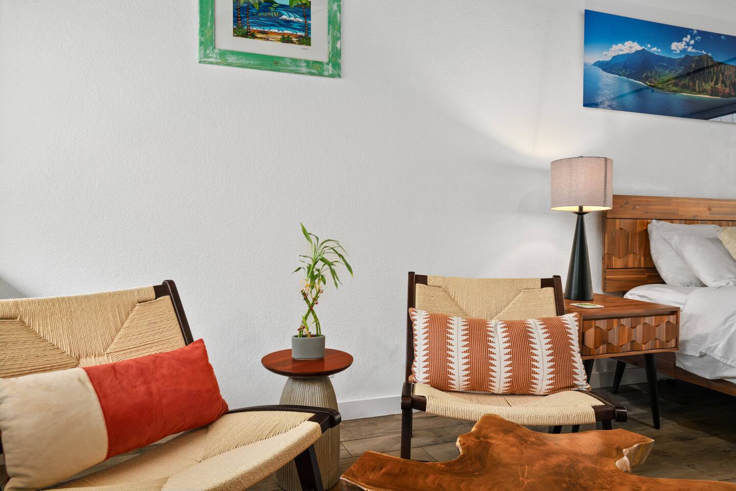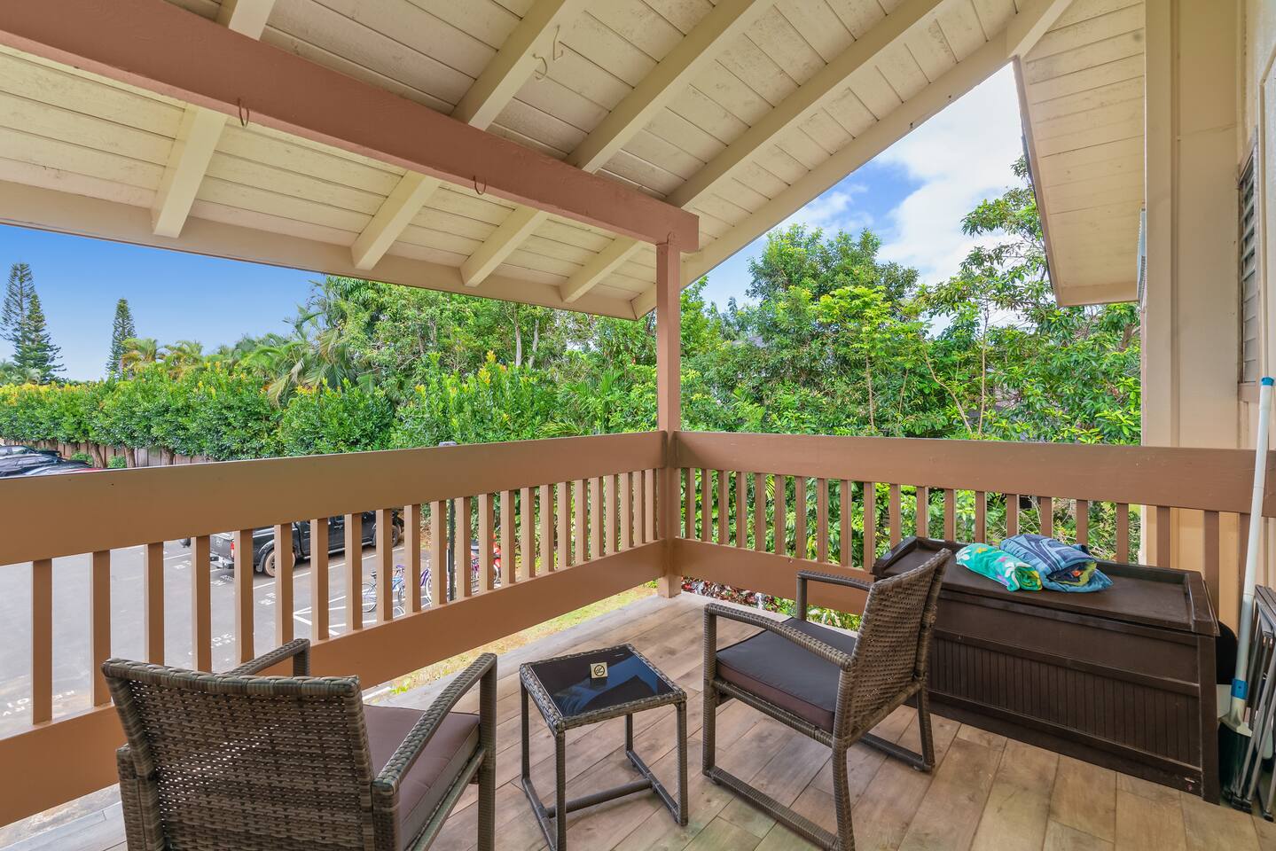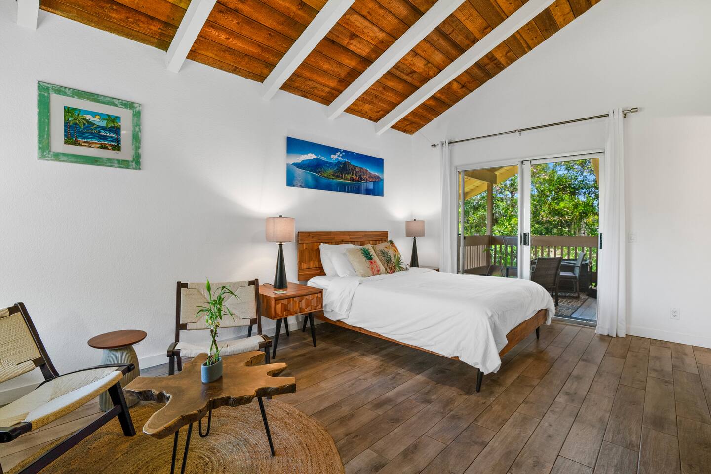 This chic, light-filled studio on Kauai's North Shore has been fully renovated to provide a luxurious and contemporary retreat for your Hawaiian vacation. The studio boasts all-new furniture, a queen-sized bed, a fully remodeled kitchenette, a high-top table with chairs, and a lanai/deck with comfortable seating to enjoy the tropical surroundings. The newly updated bathroom adds to the modern, stylish feel of the space. Location: Located in Princeville, this condo is just minutes from some of Kauai's most stunning beaches and scenic attractions, including Queen's Bath, Turtle Cave, Hideaway Beach (1 mile away), Hanalei Bay, Anini Beach, Kilauea Lighthouse, and Secret Beach (10-15 minute drive). A 10-minute walk takes you to Princeville Center, offering dining, shopping, groceries, coffee, and ice cream. Amenities: Enjoy access to the communal pool, hot tub, and BBQ area within the condo complex. We look forward to hosting you in this newly updated, modern oasis on Kauai's beautiful North Shore!