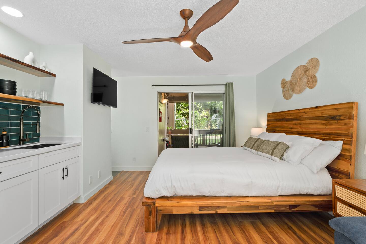 Enjoy a piece of paradise in this newly remodeled gem on Kauai's North shore. ✅ 8 Min to Hanalei ✅ Fully Equipped Kitchentte ✅ Portable AC ✅ Access to Pool, Hot Tub & BBQ ✅ Beach + Snorkel Gear ✅ Smart TV + Fast Wi-Fi ✅ Private Lanai Central to everything on the North Shore! 🛒 3 min to Groceries 🏖️ 5 min to Hideaways Beach 🌆 8 min to Hanalei Town 🏖️ 15 min to Kilauea Lighthouse or Anini Beach 🏖️ 25 min to Tunnels Beach & Haena State Park ✈️ 45 min to Lihue Airport ✨ Living Area & Private Lanai The studio features all-new furnishings, including a plush queen bed, a fully remodeled kitchenette with open shelving, a modern sofa and coffee table, and a private lanai with comfortable outdoor seating — perfect for enjoying the island breeze. The bathroom has also been completely renovated, featuring a sleek walk-in shower and updated finishes that add to the clean, contemporary feel of this thoughtfully designed retreat.