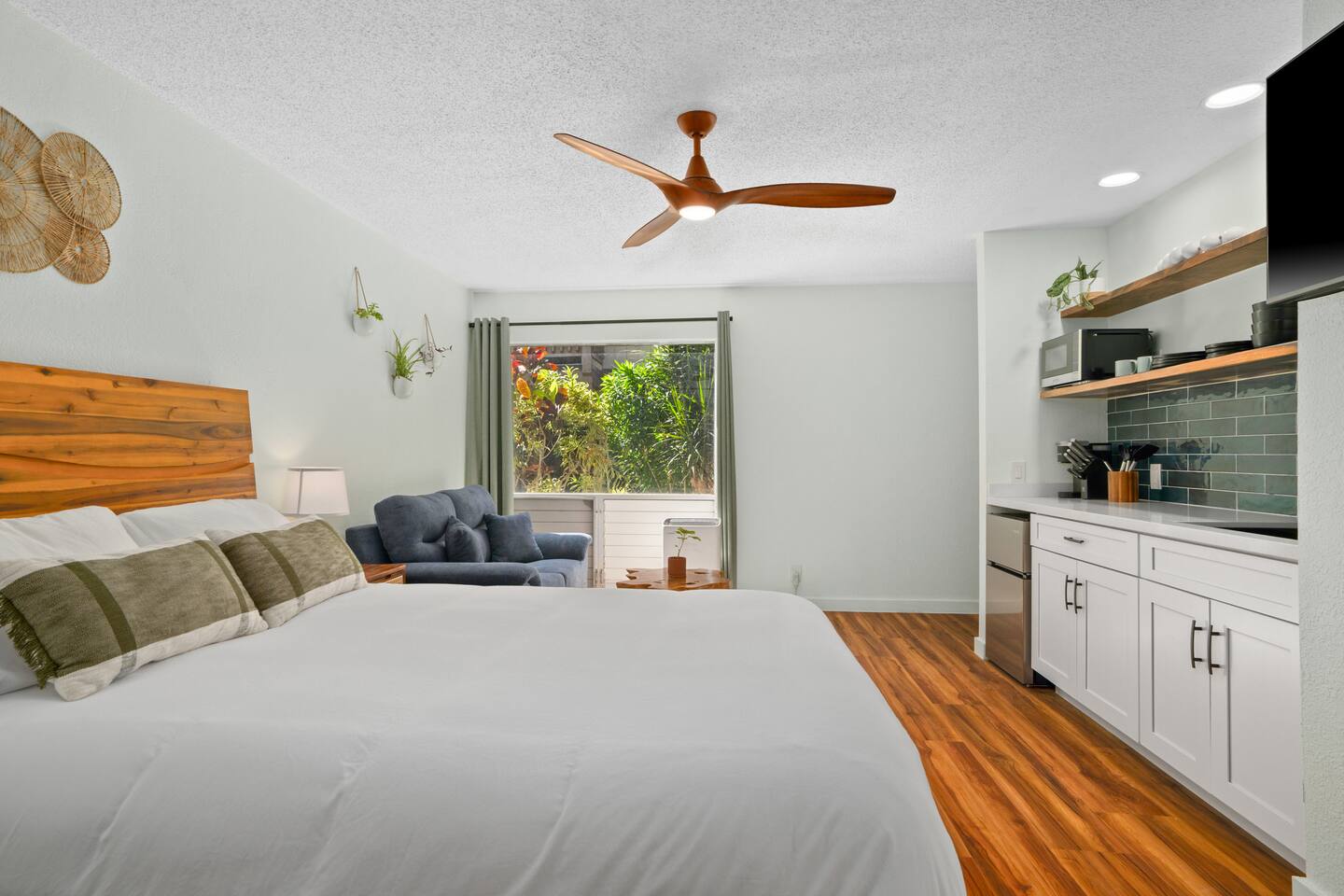 Discover modern comfort in this fully renovated studio in the heart of Princeville. Designed with clean lines and a minimalist aesthetic, the space features a sleek kitchenette, updated finishes, and AC for a cool, relaxing stay. Just minutes from world-class beaches, scenic trails, and local favorites. Walk to shops, restaurants, and cafes at Princeville Center in under 10 minutes. Your stylish Kauai escape awaits.
